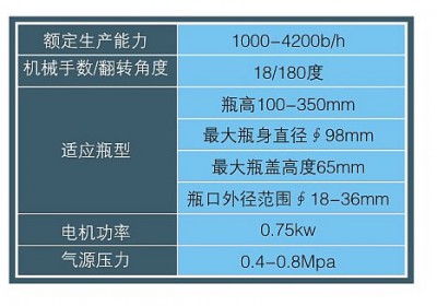 本產(chǎn)品自動化程度高,節(jié)省人工:機械手工作穩(wěn)定可靠,產(chǎn)品檢驗簡單明了:翻轉(zhuǎn)導(dǎo)軌與機械手同步協(xié)調(diào),增大了瓶高適應(yīng)范圍。